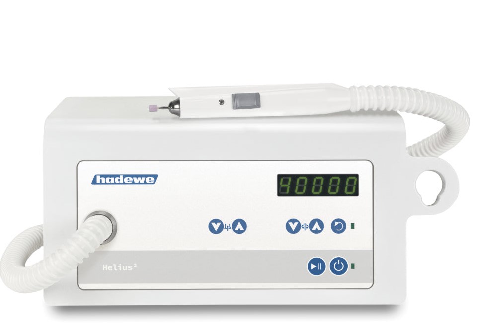 Das Fußpflegegerät Helius 2 mit integrierter Absaugung überzeugt durch hohe Laufruhe,
